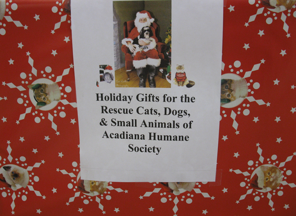 Please look for the holiday wrapped gift box, as seen in the photo above, at the Lafayette Petco between the cat cages in the front of the store. Petco is located at 3215 Louisiana Avenue. If you prefer to give these holiday gifts to the Acadiana Humane Society volunteers directly, we will be at Petco on Saturday, December 18th from 12Noon until 4PM for our adoption event and bake sale. You can meet some of our adoptable cats, dogs, and exotic pets at our adoption event.