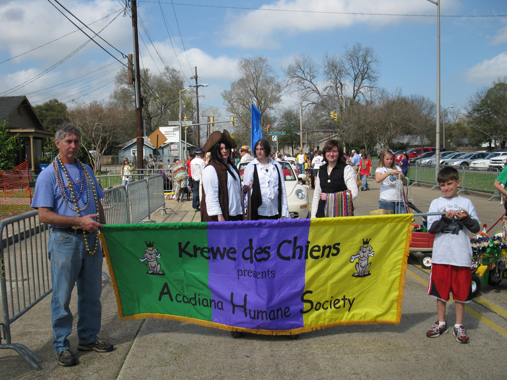 Acadiana Humane Society volunteers and foster dogs had a great time on Saturday, February 26th at the Krewe des Chiens dog parade! Click the 2011 Krewe des Chiens Dog Parade link to view photos taken by some of our volunteers. You can also like Acadiana Humane Society on Facebook to see our current photos, newest rescues, and upcoming events.