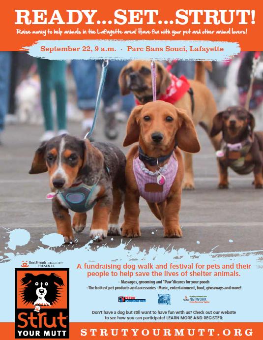 Get ready, get set, get your pooch warmed up ..it’s time for Best Friends Animal Society’s First Annual Strut Your Mutt in Lafayette, Louisiana.  Join us for a leisurely morning walk to help homeless pets in the Lafayette area, and then celebrate afterwards at our ultimate doggie festival.