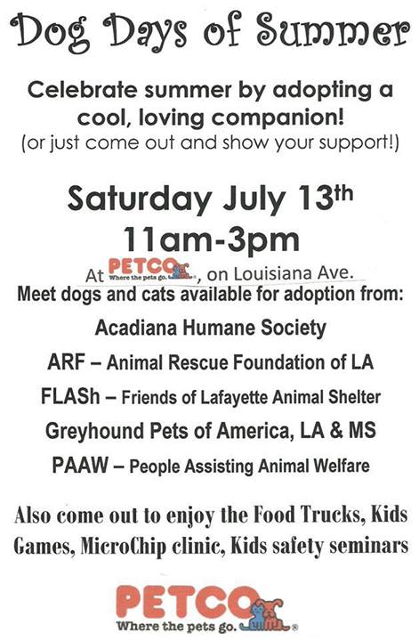 Please join Acadiana Humane Society & other area animal rescues in Petco’s Dog Days of Summer Luau on Saturday, July 13th from 11am to 3pm! Petco is located at 3215 Louisiana Ave. in Lafayette, LA.