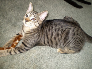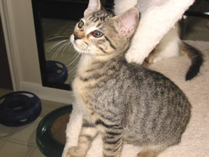 young tabby cat, jumping, playing and even fetches paper balls. He